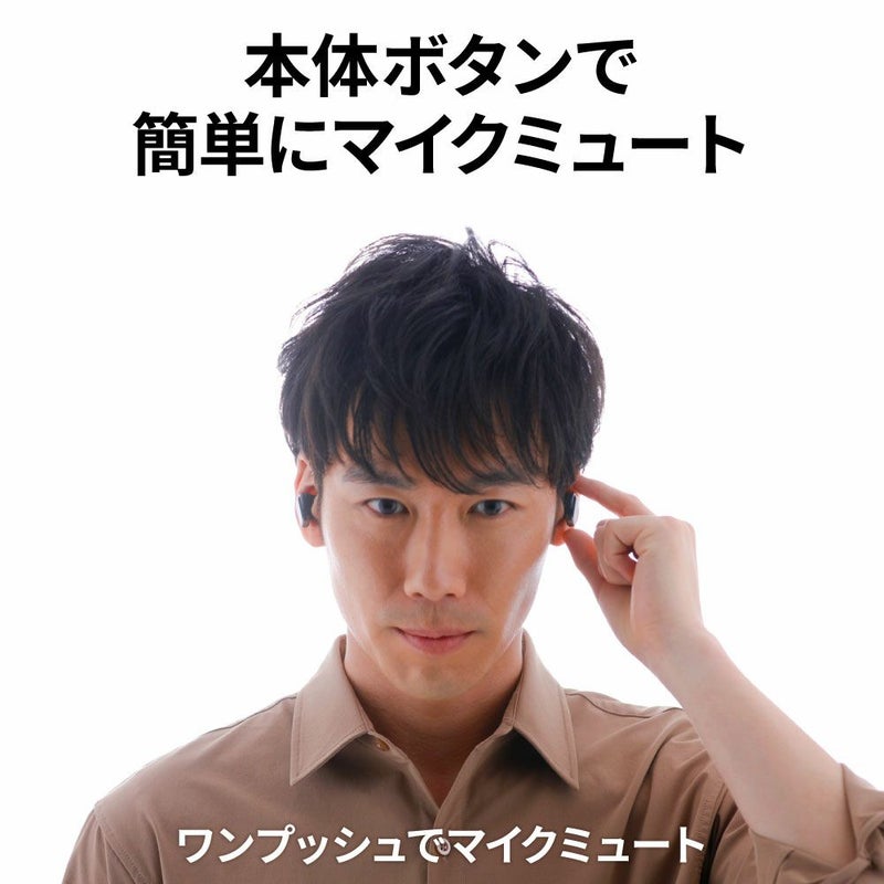 オンライン会議時には、パソコン操作をせずにイヤホン本体のプッシュ式ボタンを押すだけで、マイクミュート(ON/OFF切替)ができます。また、音楽再生時には本体ボタンで、外音取込みのON/OFFもできます。
