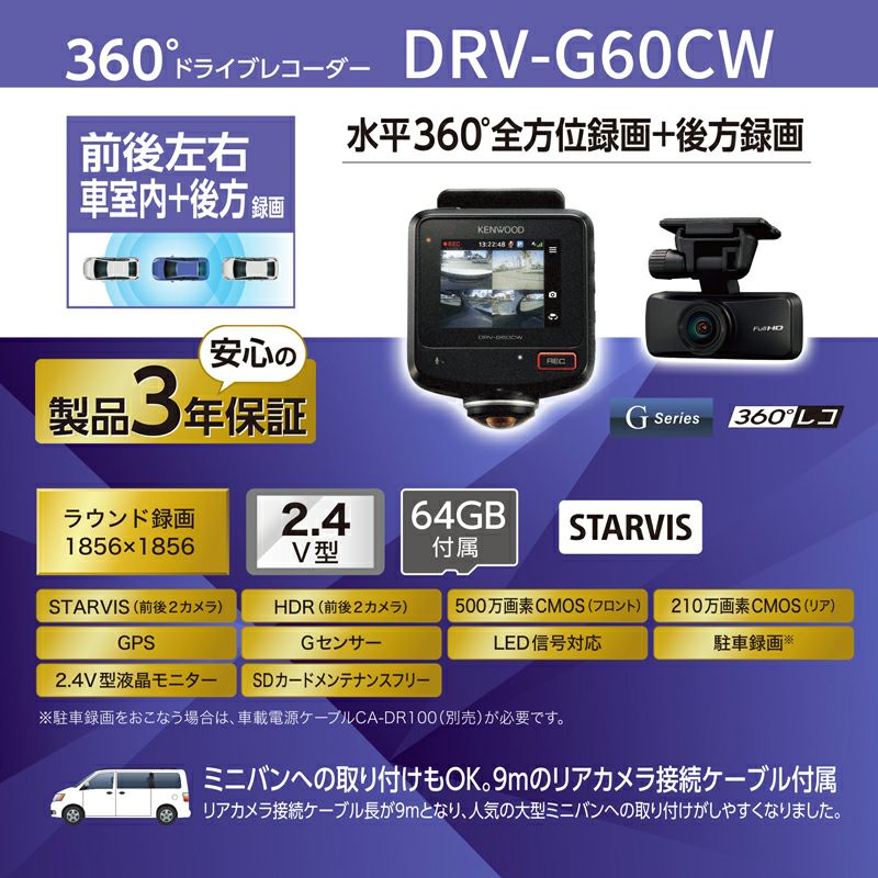 5. 360°撮影対応 2カメラドライブレコーダー DRV-G60CW STARVIS搭載 SDカードメンテナンスフリー 大容量microSDカード対応 ステッカー付き
