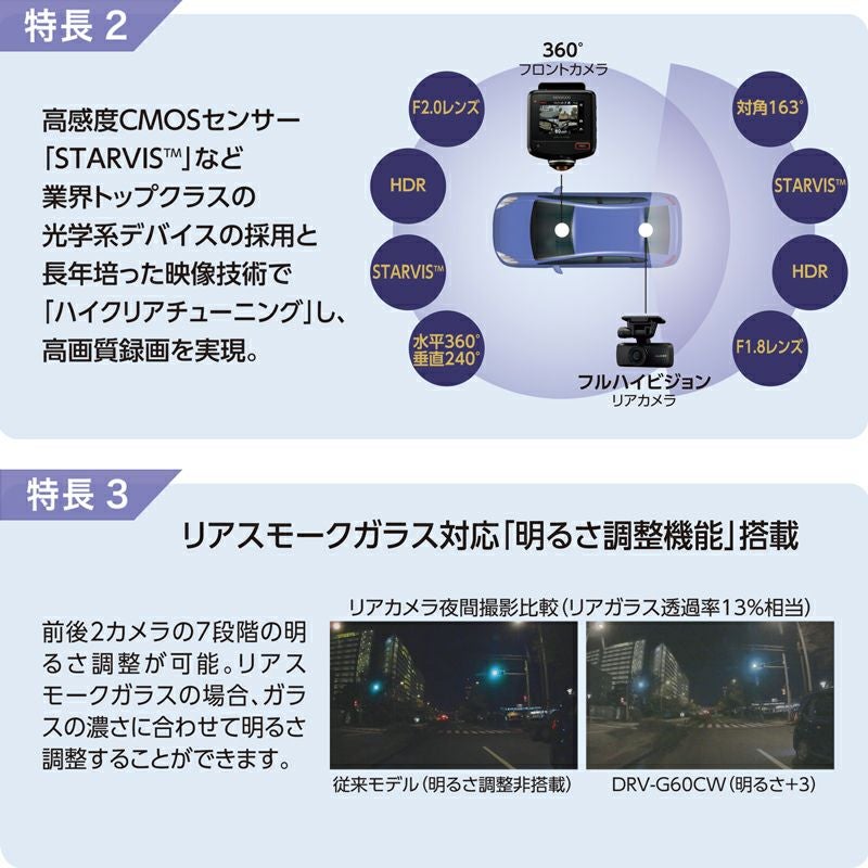 360°撮影対応 2カメラドライブレコーダー DRV-G60CW STARVIS搭載 SDカードメンテナンスフリー 大容量microSDカード対応 ステッカー付き