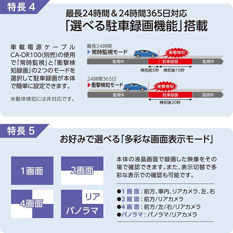 また、別売りの車載電源ケーブル「CA-DR100」を取り付けていただくと最長24時間の駐車監視録画が可能になり、車上荒らし・当て逃げにも対応。
