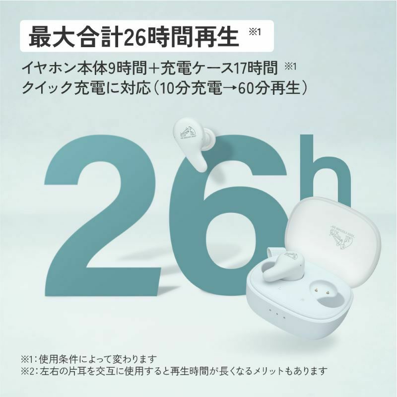 イヤホン:最大約9時間、充電ケース:最大約17時間(計:最大約26時間)