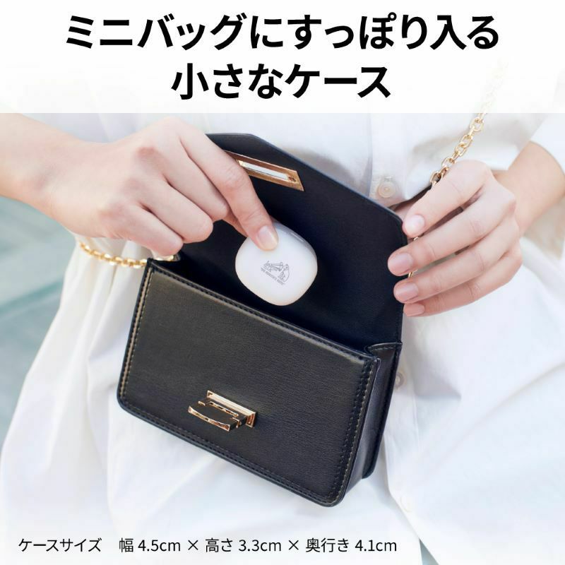 女性や若い方の小さな耳にも収まりやすい本体形状、ミニバッグなどでも持ち運びしやすい小型チャージャーケースと小さなサイズ・デザインにこだわりました。またトレンドを意識したニュアンスカラーの5色のカラーバリエーションを採用しています。