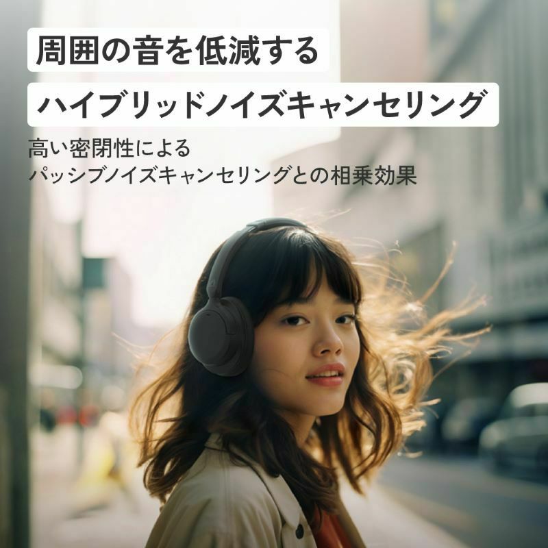 周囲の音を低減するハイブリッドノイズキャンセリング機能と、オーバーイヤー形状の高い密閉性による効果で、騒がしさが気になる環境でも音楽やコンテンツリスニングを快適に楽しめます。