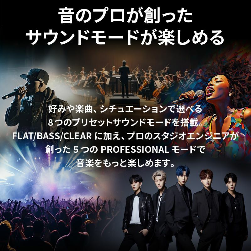 好みや楽曲、シチュエーションで選べる、8つのプリセットサウンドモードを搭載。 お馴染みの3つの「FLAT/BASS/CLEAR」モードに加え、ビクタースタジオのプロのエンジニアが創った 5つの「PROFESSIONAL」モードで、様々な音楽の楽しみ方を提案します。