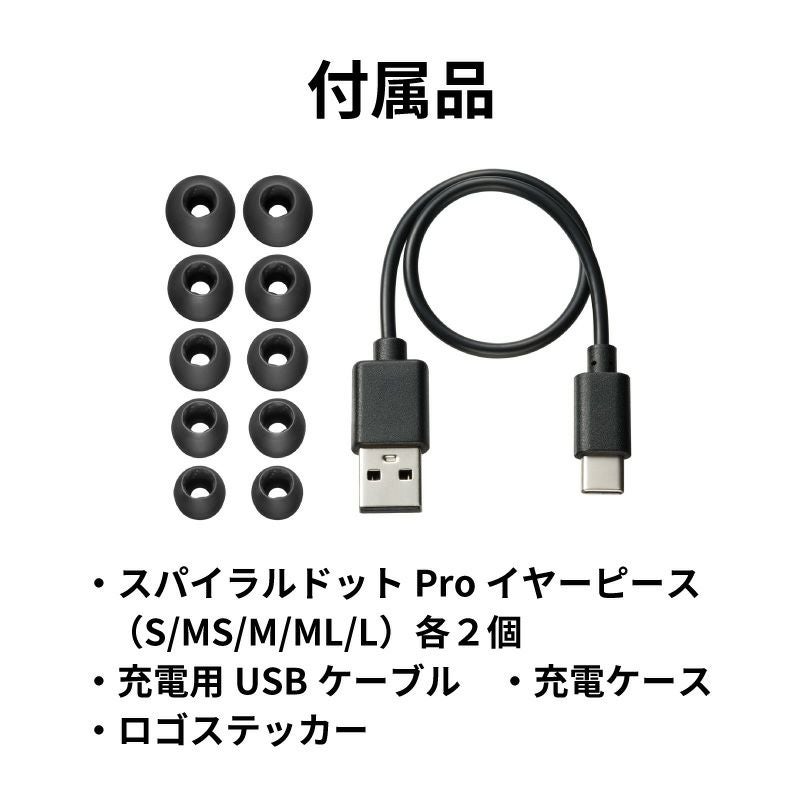 付属品 スパイラルドットProイヤーピース(S/MS/M/ML/L)各2個、充電ケース、充電用USBケーブル、ロゴステッカー