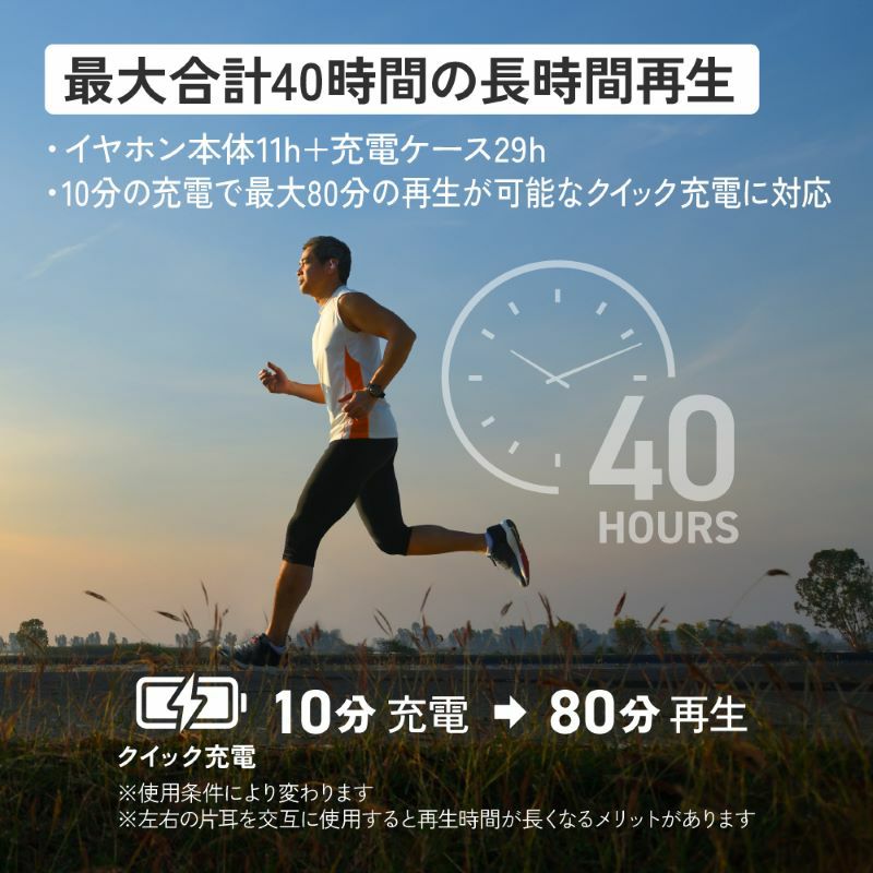 イヤホン本体11時間+充電ケース29時間(※)最大合計40時間の長時間バッテリーで充電切れの心配がありません。