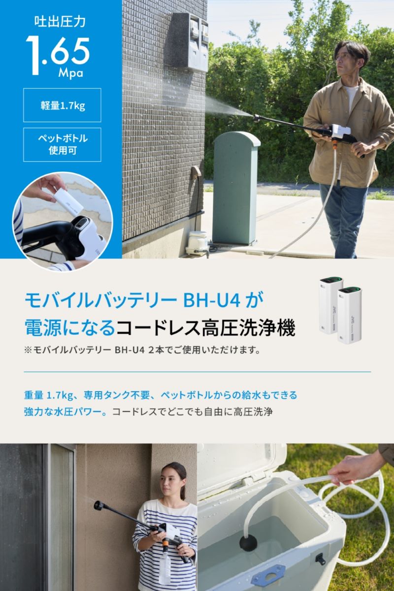 モバイルバッテリーBH-U4を電源として差し込むことで使用でき、コンセントのない場所でも高圧洗浄が可能になりました。自宅駐車場から離れた場所での洗車、ベランダや玄関、外壁の清掃など、コンセントの位置を気にすることなく高圧洗浄作業を行えます。