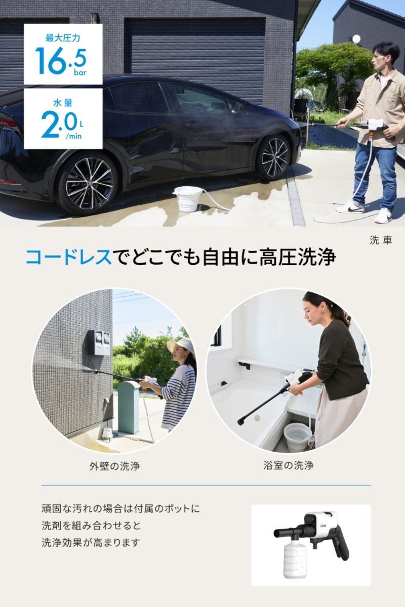 家庭での洗車や外壁洗浄を手軽に行いたい方、定期的なベランダ・玄関・外階段の清掃をしたい方、軽量な高圧洗浄機をお求めの方に。ガーデニングやアウトドアの道具の洗浄にもおすすめです。