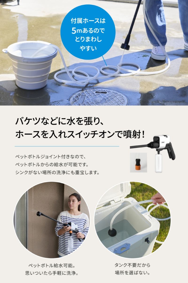 バケツなどに水を張り、付属のホース(5m)で給水可能。またペットボトルジョイントも付いているので、ペットボトルからの給水でもより身軽に作業が可能です。汚れがひどい場合には、付属のフォームボトルに洗剤を入れることでよりきれいに仕上がります。