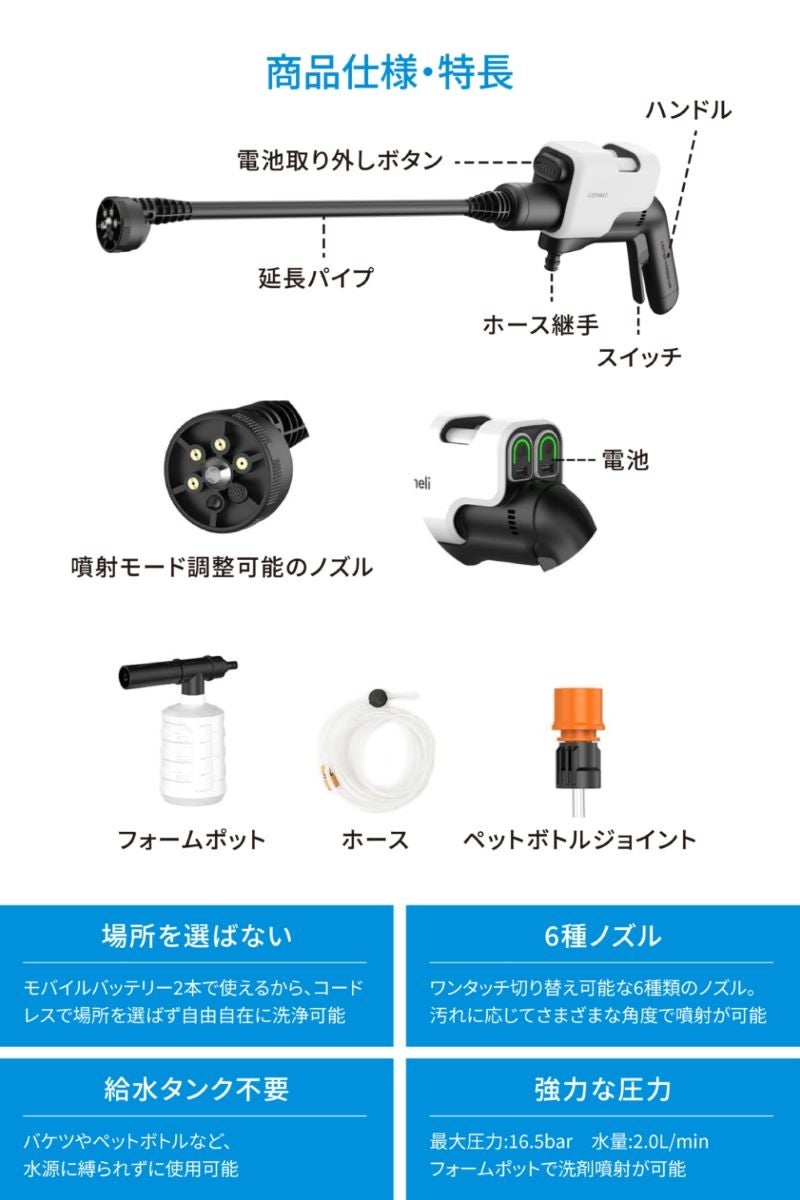 付属品 6-IN-1ノズル+延長ロッド、フォームボトル、ホース、ペットボトル接続ヘッド、取扱説明書