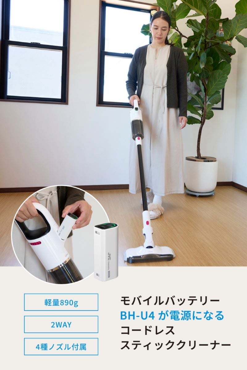 モバイルバッテリーBH-U4を電源として差し込むことで使用でき、コンセントのない場所でも清掃が可能です。ご自宅のさまざまな場所での清掃、車の清掃などに活躍します。掃除中に充電が切れてしまった場合でも、充電済みの予備バッテリーがあれば、差し替えるだけで掃除を続けることができます。