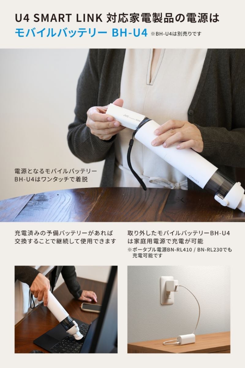 • U4 SMART LINK 対応製品。モバイルバッテリーBH-U4(※別売/1個使用)で駆動させることができます