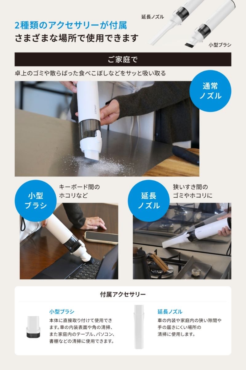 • 小型ブラシや延長ノズルが付属し、さまざまな場所の清掃に
