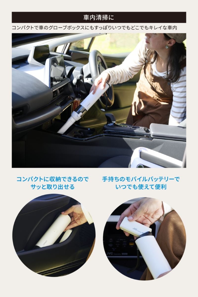 モバイルバッテリーBH-U4を電源として差し込むことで使用でき、コンセントのない場所でも清掃が可能です。ご自宅のさまざまな場所での清掃、車の清掃などに活躍します。掃除中に充電が切れてしまった場合でも、充電済みの予備バッテリーがあれば、差し替えるだけで掃除を続けることができます。