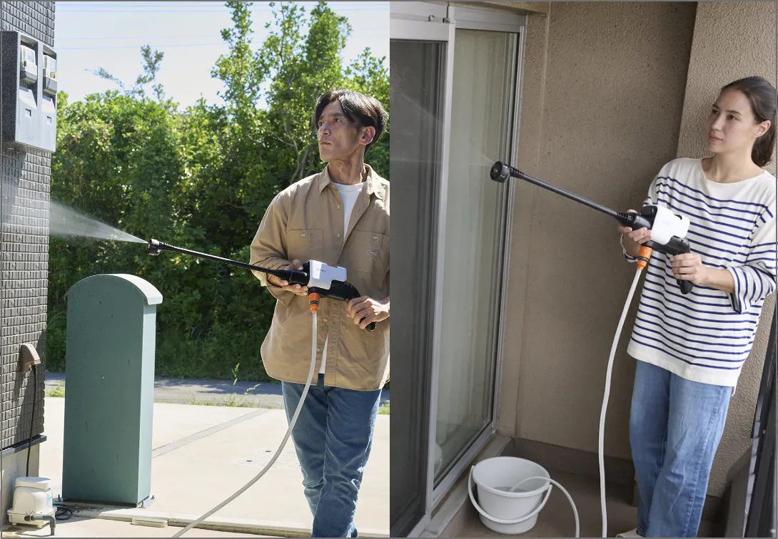 自宅での洗車、ベランダや玄関などの清掃、外壁やフェンスの大掃除におすすめです。ガーデニングの道具、プランターの洗浄、テーブル清掃、自転車、バイクのメンテナンス、エアコン室外機の清掃にも活躍。電源コードや給水源の制約にとらわれず、さまざまな場所で本格的な高圧洗浄作業を実現します。