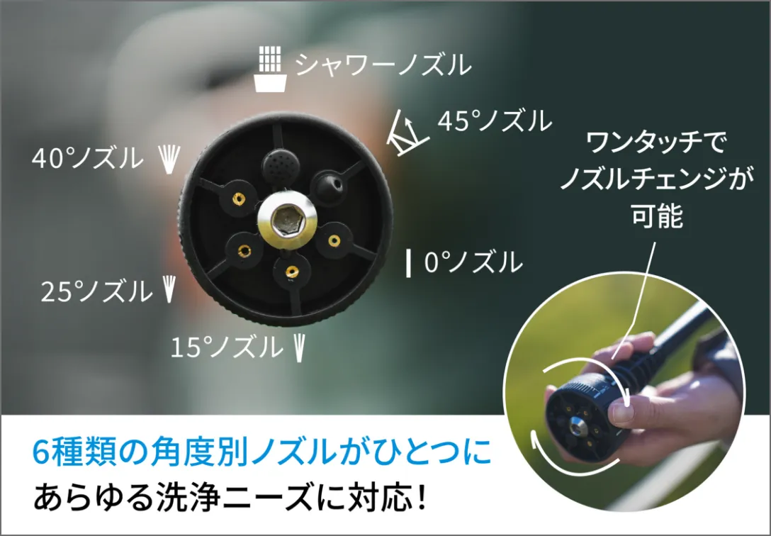 6種類の角度別ノズルにより、用途に応じた洗浄が可能。ノズルを回すだけで簡単に切り替えることができます。