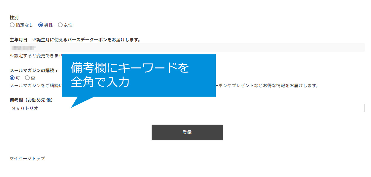 備考欄に全角の数字・カタカナで「990トリオ」と入力。