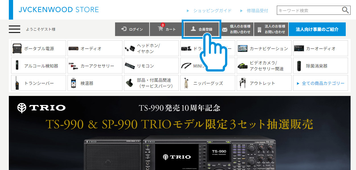 JVCKENWOOD STORE にアクセスして会員登録をクリック。