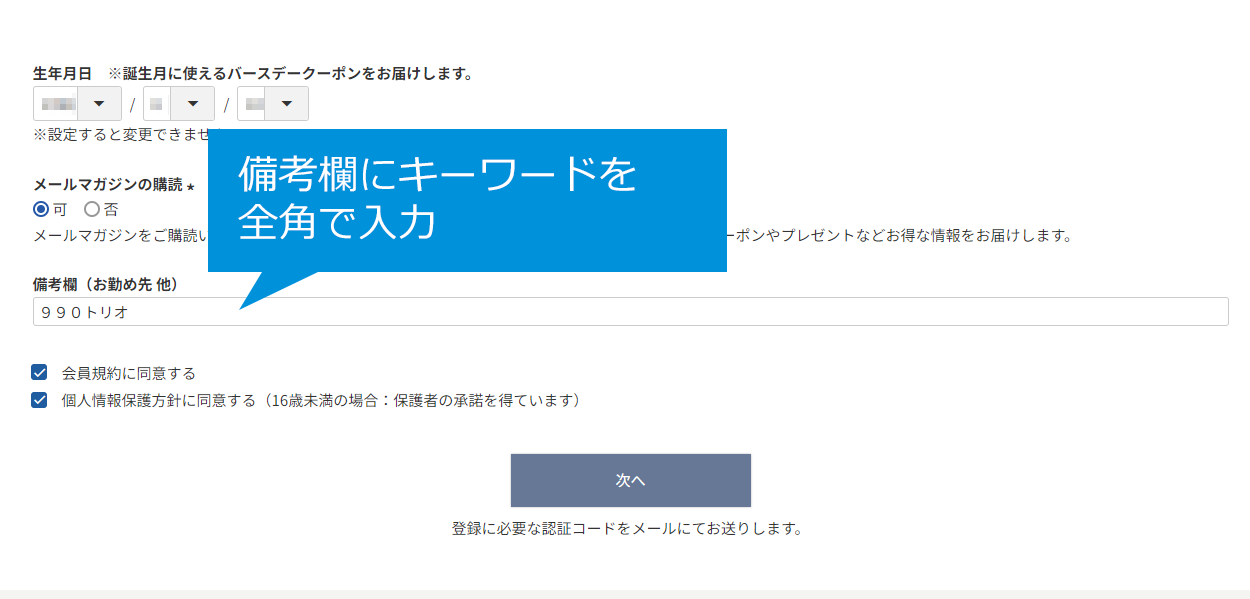 備考欄に全角の数字・カタカナで「990トリオ」と入力し、次へクリック