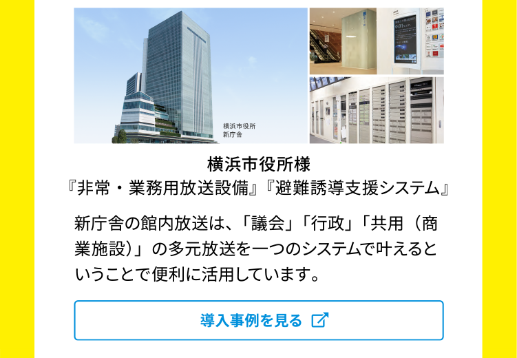 災害時に役立つ 防災対策キャンペーン ページ内リンク ポータブル電源 ポータブルソーラーパネル あると便利関連アイテム 防災対策できていますか? 災害時に誰かと繋がることは、心の安心 JVCケンウッドがおすすめ ポータブル電源タイトル ポータブル電源エリア ソーラーパネルタイトル ソーラーパネルエリア 関連アイテムタイトル 関連アイテムエリア BH-B20 BH-SC5 トランシーバー トランシーバー 企業向け 会社・建物・地域を守る防災対策タイトル 導入事例 横浜市役所様 石巻市防災センター 東京国際展示場 会社・建物・地域を守る防災対策タイトル 施設管理者の皆様必見