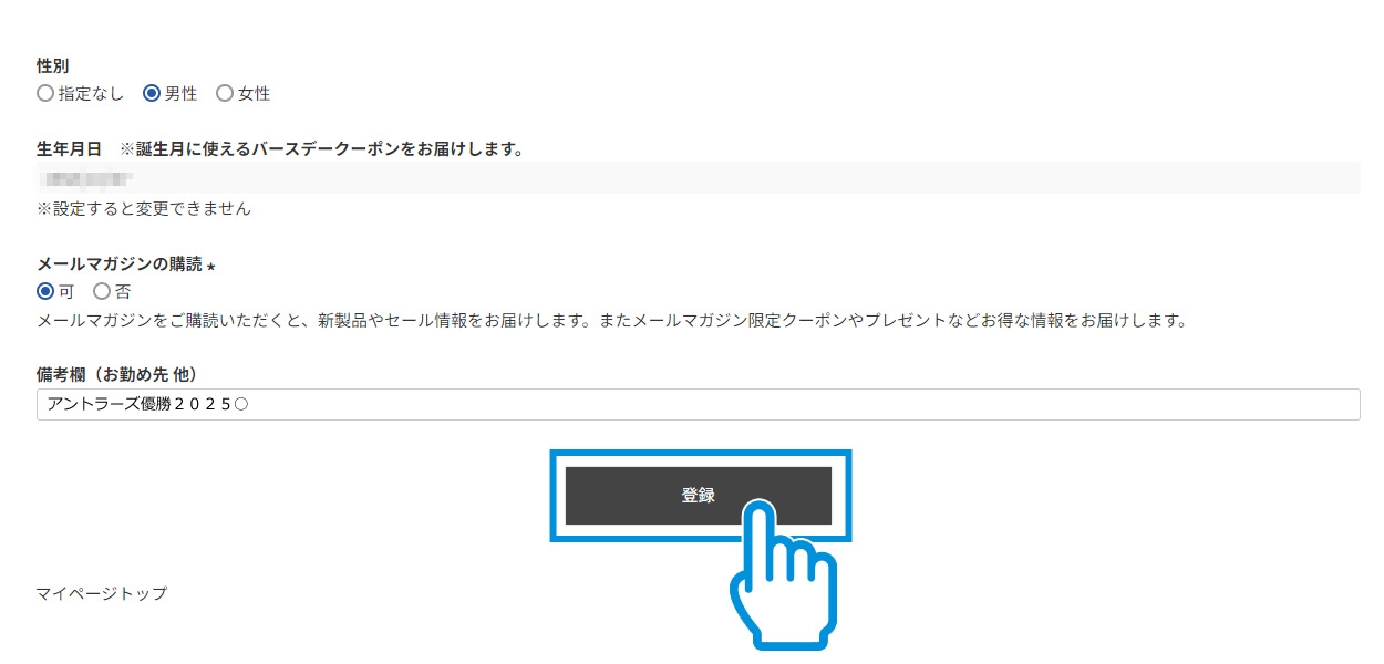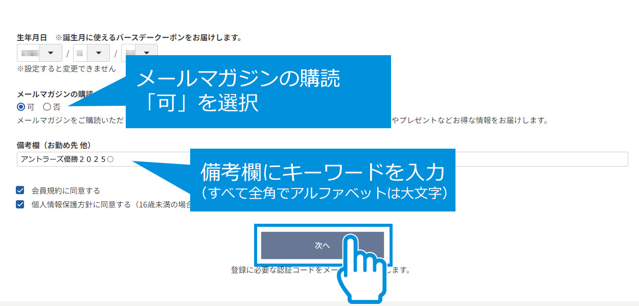 備考欄に応募したい景品のキーワードを入力し、登録内容の確認後、