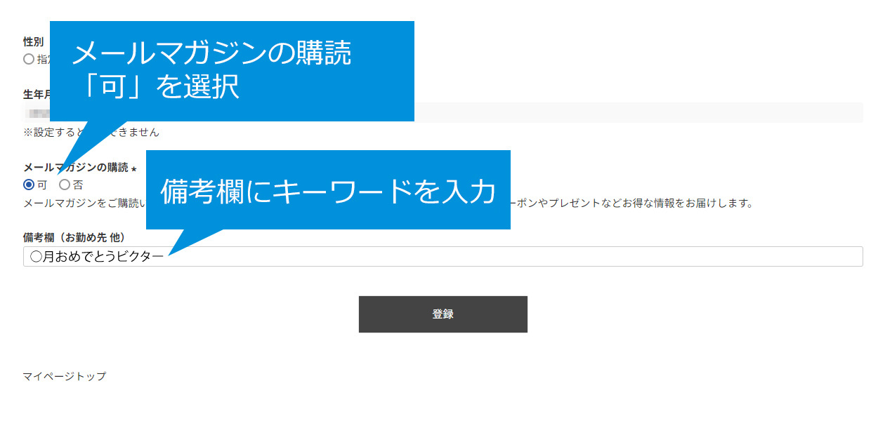 メールマガジンの購読「可」を選択し、