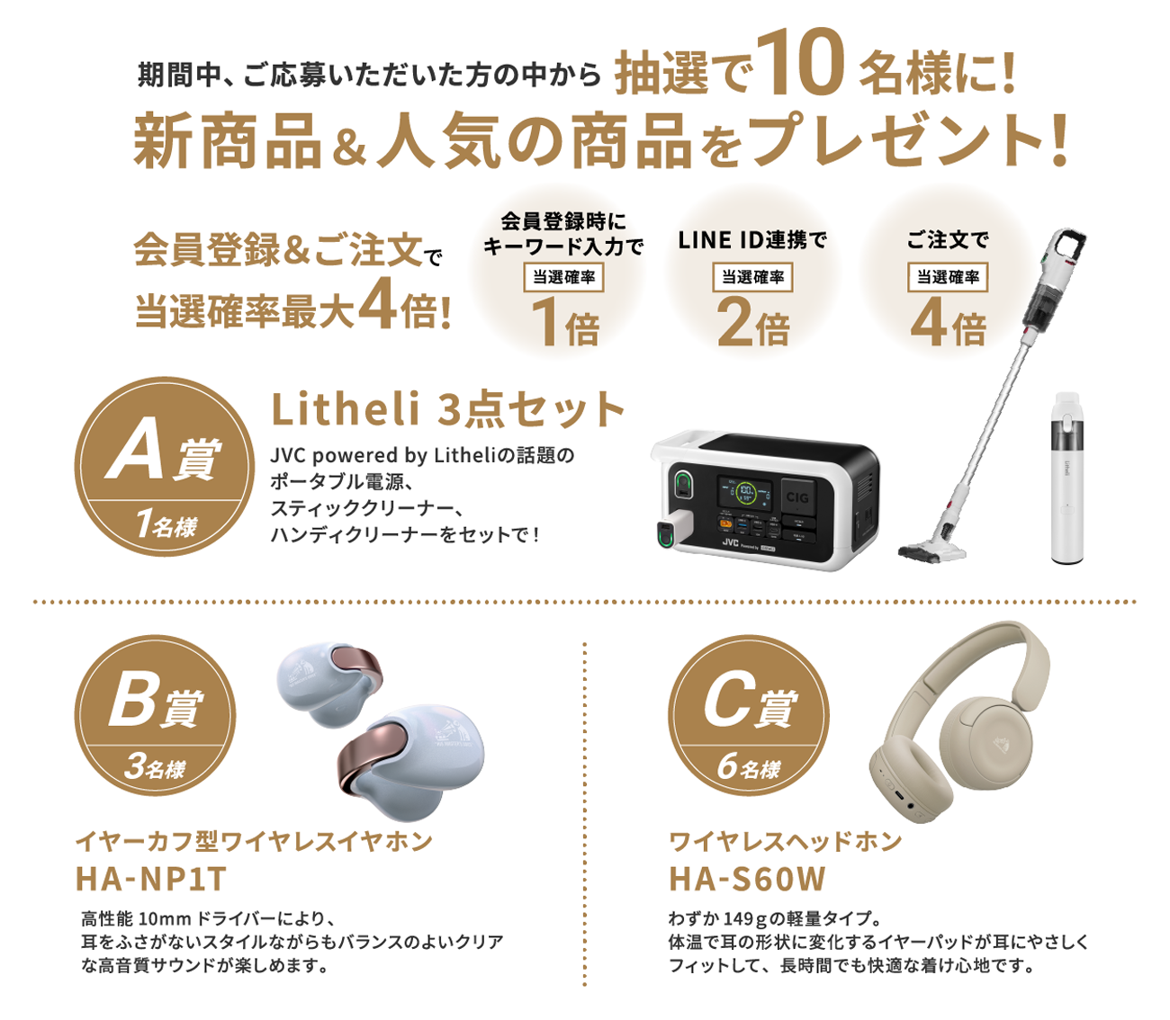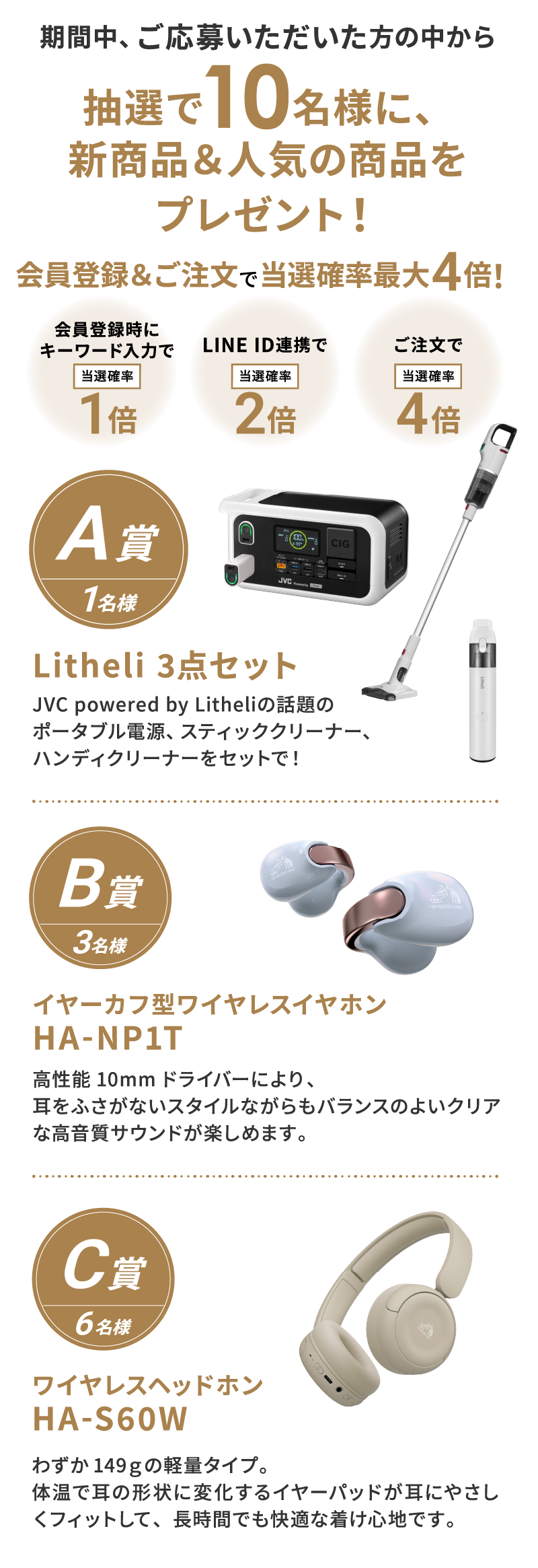 - ※メールアドレス「STOREINFO_JKC@online-store.jvckenwood.com」からご当選のメールを送付させていただきます。あらかじめ受信できるようメール設定をご確認ください。