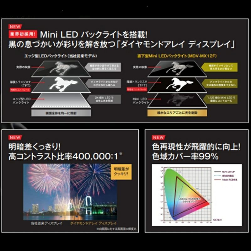 他の画像を見る 【予約キャンペーン準備中】10V型フローティング ナビゲーション 彩速ナビ MDV-MX12F MiniLEDバックライト採用 Apple CarPlay / Android Auto 対応 地上デジタルTVチューナー内蔵 DVD/USB/SD HDパネル搭載 音声操作対応 販売価格 ¥ 220,000 税込 在庫切れ 再入荷お知らせ お気に入りに登録する 販売期間 〜 2026/01/12 23:59